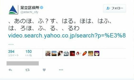 足立区役所「、あのほ、ふ?す、はる。ほは、はふ、は、ろほ、ふ、る、、るわ」と意味不明ツイート