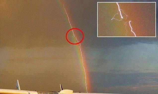 ドイツの写真家が、虹が出ている中で、雷が飛行機に落ちる瞬間をとらえたそうです。