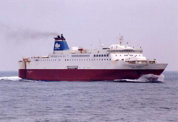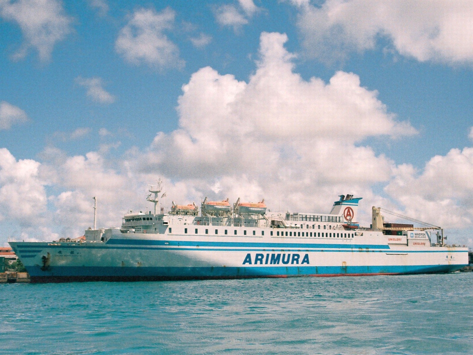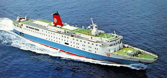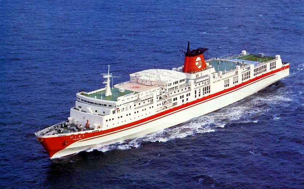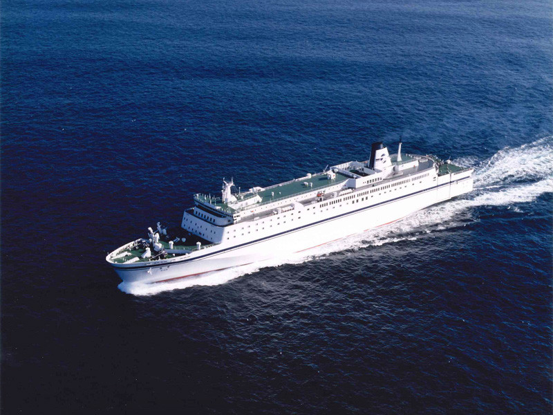 中央部の平たいダミーファンネルには多目的ホールと喫茶室を設備。1996年フィリピンへ売却。