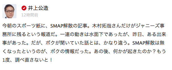 まずは第一報。最初のポイントは日刊とスポニチの2紙そろい踏みという点です。つまり、功を焦った1社の記者が「えいや」で飛ばし気味で書いたのではないということですね。ただ、今回は、それで「複数の社が報道したことで流れが固まるのかなー」と思いきや、芸能レポーターのベテラン井上公造さんが「775」でこんな発信をしてネット上のニュースは微妙にカオス化。