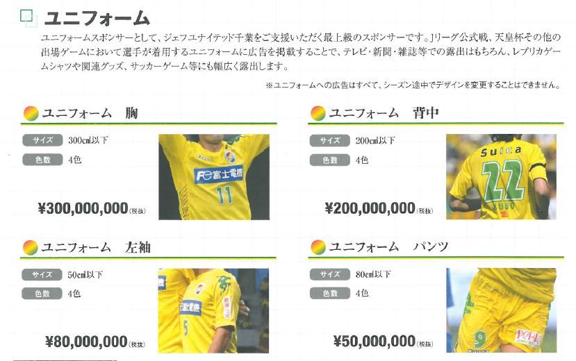胸 1億~1億8000万(ユニフォームメーカーロゴは広告扱い)