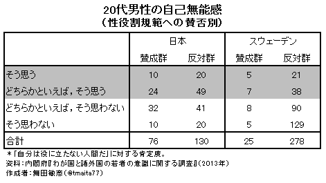 日本は,両群の差は有意ではありませんが,性役割規範に反対のオトコのほうが無能感が高いというのは,欧米には見られない特徴です。上記の内閣府調査の対象は,日本,韓国,アメリカ,イギリス,ドイツ,フランス,スウェーデンですが,こうした傾向が出るのは,日本と韓国だけです。他の欧米5か国では,反対群より賛成群の無能感が有意に高くなっています。