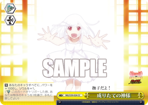 【自】自分のクライマックス置場に「成りたての神様」が置かれた時、自分のキャラを1枚選び、そのターン中、次の能力を与える。 『【自】このカードのバトル相手がリバースした時、相手のキャラを1枚選び、手札に戻してよい。』