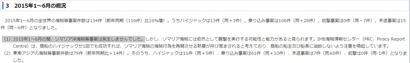 (1)2015年1~6月の間、ソマリア沖海賊等事案は発生しませんでした。しかし、ソマリア海賊には依然として襲撃を実行する可能性と能力があると見られます。IMB海賊情報センター(PRC、Piracy Report Centre)は、商船のハイジャックが1回でも成功すれば、ソマリア海賊の海賊行為を再開させる熱意が呼び覚まされると考えており、商船の船主及び船長に油断しないよう注意を喚起しています。