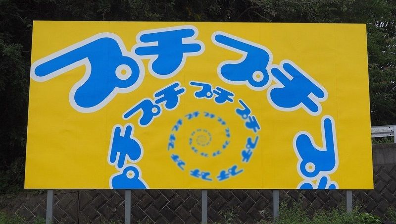 日向岡住宅を過ぎると、列車は鷹取山と湘南平に挟まれた狭い谷に入る。トンネルをひとつ抜けて間もなく、A席側に見える野立て看板は見逃せない。「プチプチプチプチ……」とらせん状に書かれた黄色い看板。「727」と同様何が言いたいのかわからない、ユニークな広告だ。しかも、この看板は全国でここ1カ所にしかない。