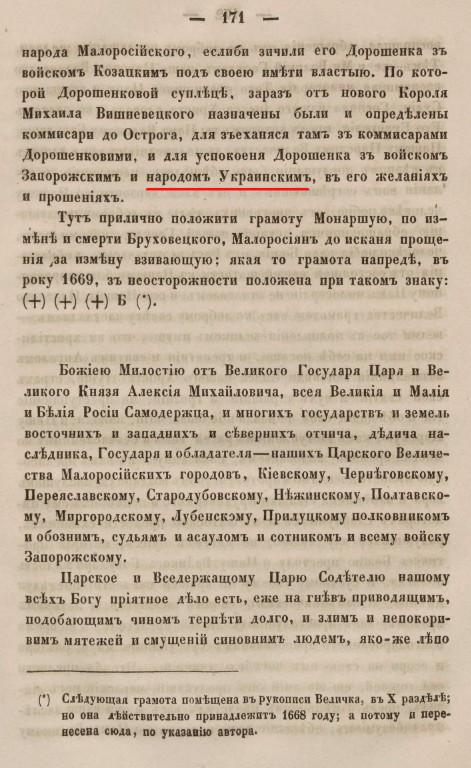 На с. 171 Величко пише: "…зъ коммисарами Дорошенковими, и для успокоенія Дорошенка зъ войскомъ Запорожскимъ и народомъ Украинскимъ, въ его желаніяхъ и прошеніяхъ”