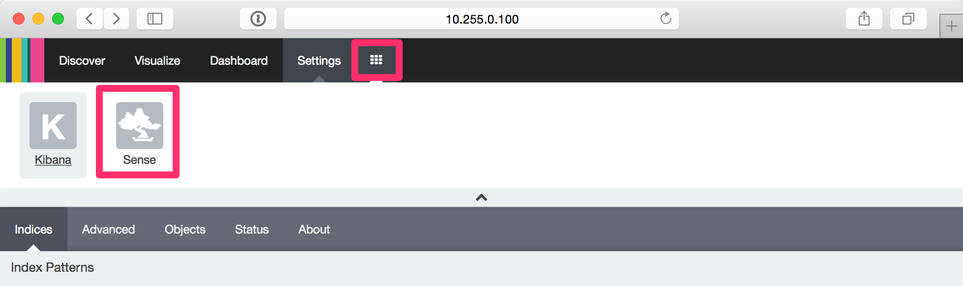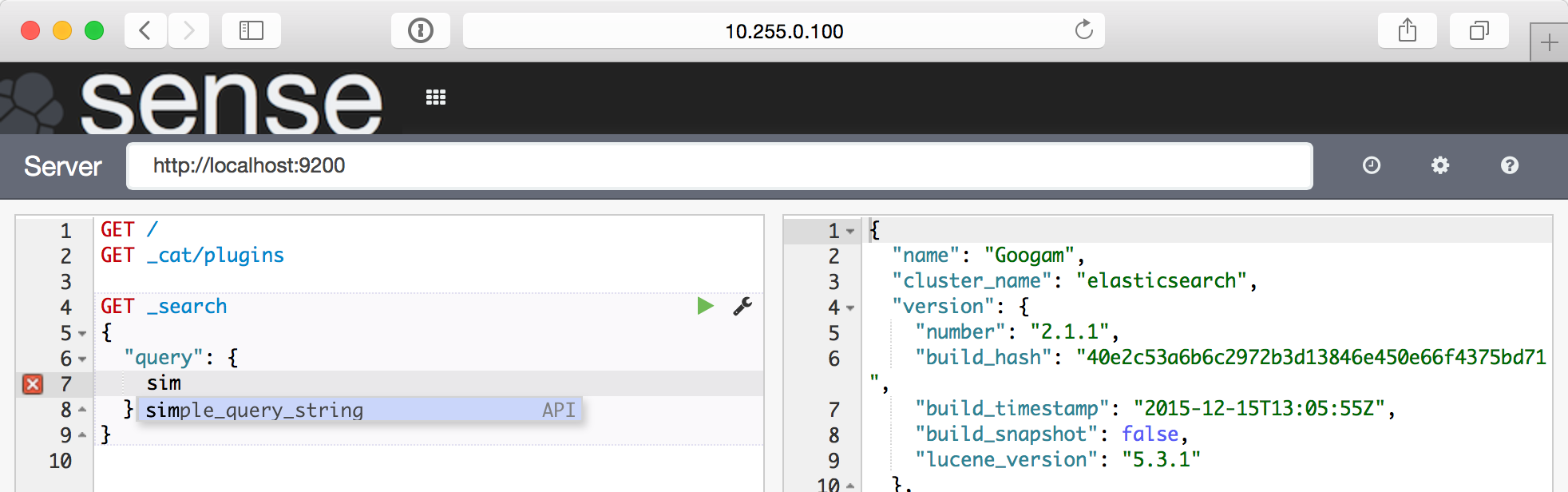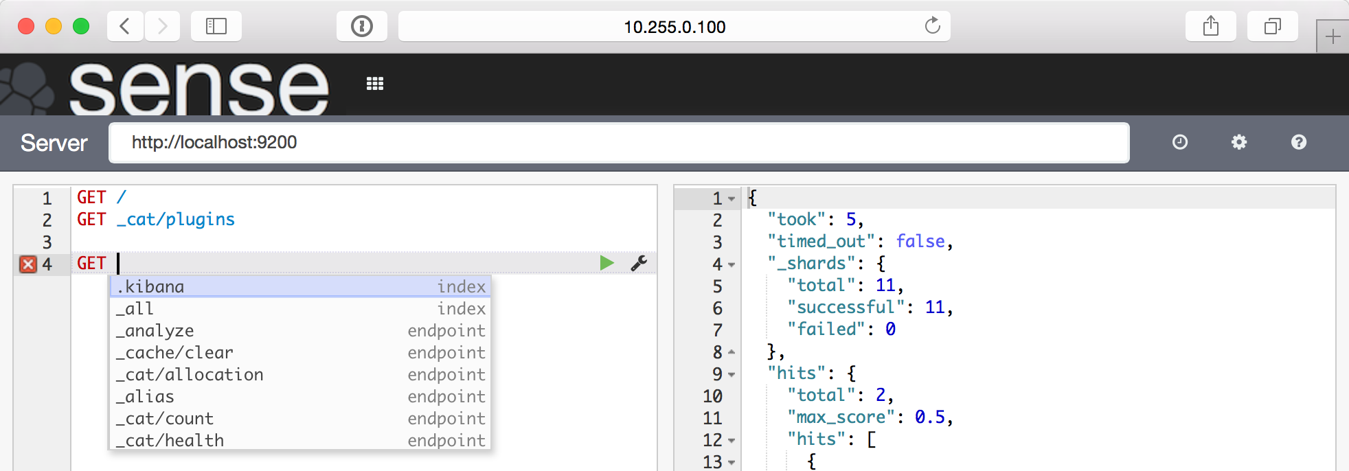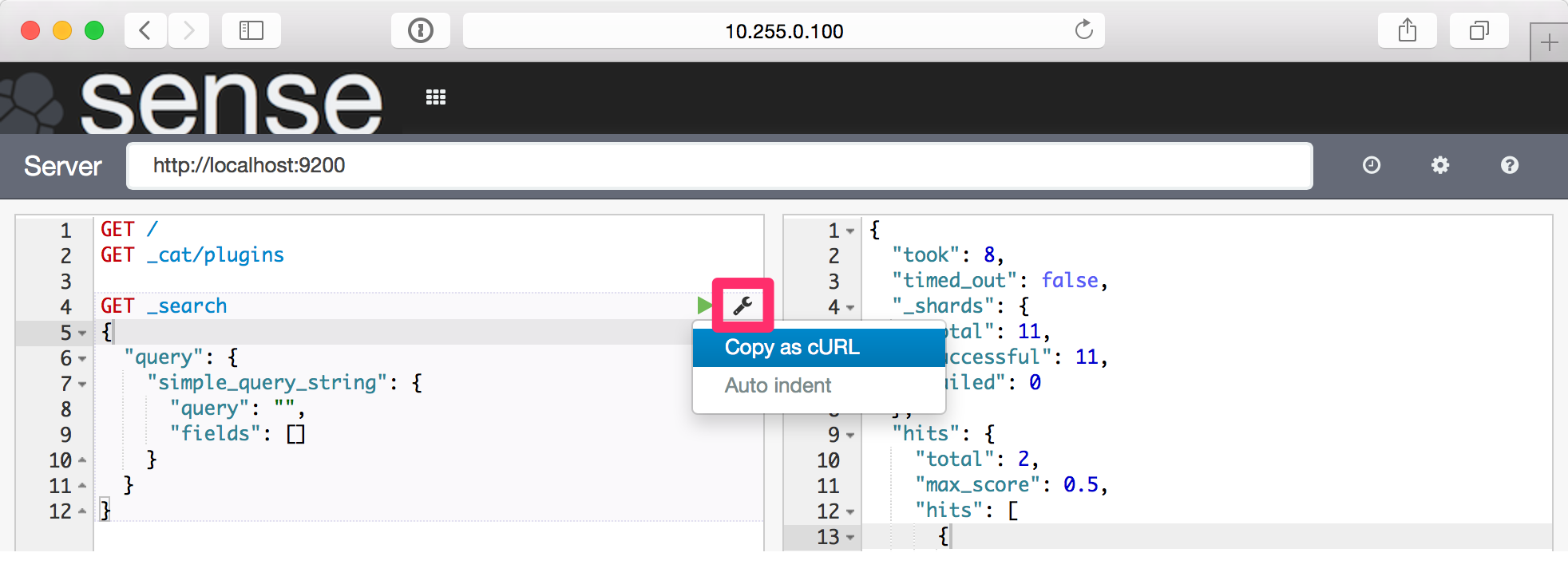 画面上部のプラグインメニューを展開すると、Senseが追加されていますので、クリックするとSenseの画面へ遷移します。