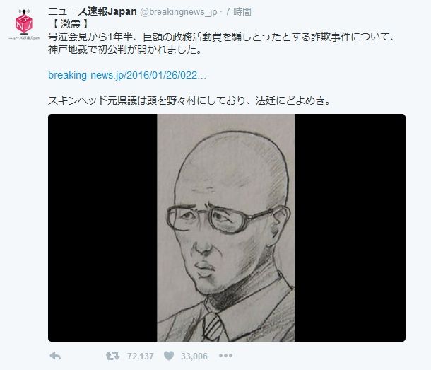 26日、ニュース速報Japan公式Twitterの野々村竜太郎被告にまつわる投稿が、話題を呼んでいる。