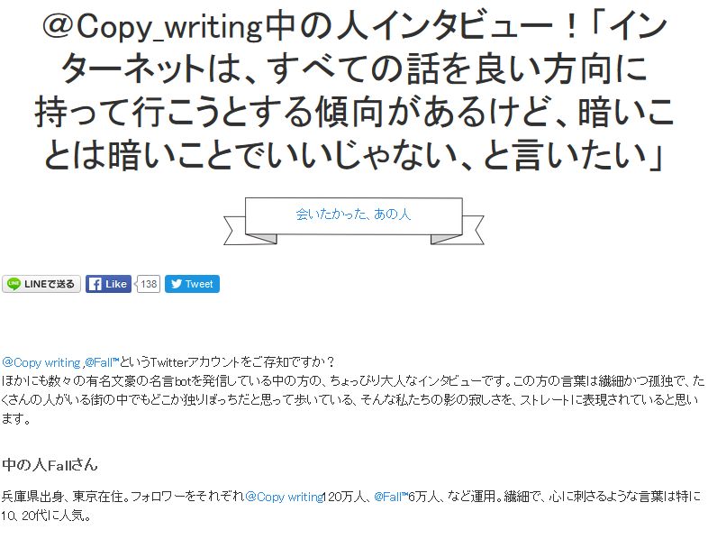 【会いたかったあの人】@Copy__writing 中の人インタビュー!「インターネットは、すべての話を良い方向に持って行こうとする傾向があるけど、暗いことは暗いことでいいじゃな... https://t.co/v8bYMCTXHM pic.twitter.com/UtVqxxjbG9