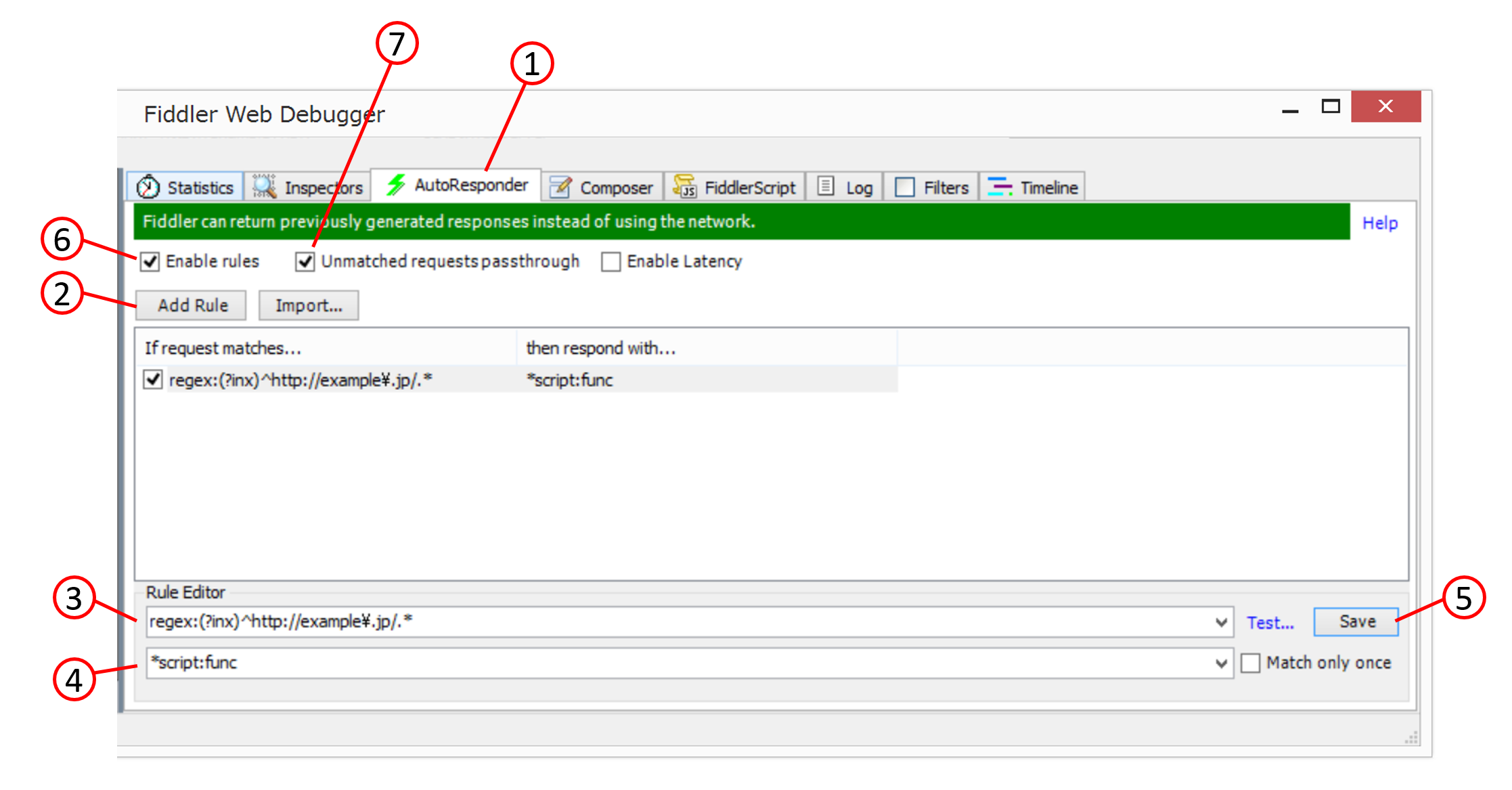 AutoResponder機能を有効にするために⑥の「Enabled Rules」にチェックを入れることを忘れないようにしてください。また、⑦の「Unmatched request passthrough」にチェックを入れていないとルールに合致しないリクエストに対してブラウザに404応答を返してしまいますので、必要に応じてチェックを入れておきましょう。