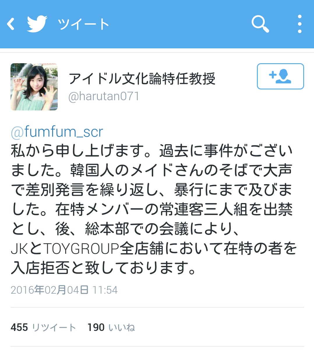 「アイドル文化論特認教授」ってコイツ誰やの?で、何でメイドが韓国人だとわかったんだ?で、何でソイツに何かしたのが在特会だと判明したんだ?口で言っても嘘を言ってるかも知れないのに。