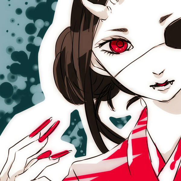 (黒髪、眼帯、牙、赤くて長い爪、鬼、和風)