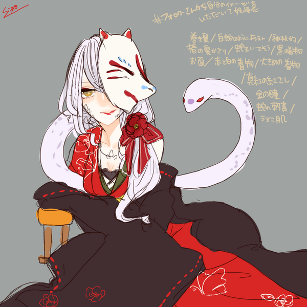 巻き髪/白蛇のような妖艶で神秘的/椿の花飾り/蛇巻く/黒の着物/お面/赤と白の着物/大きめの着物/