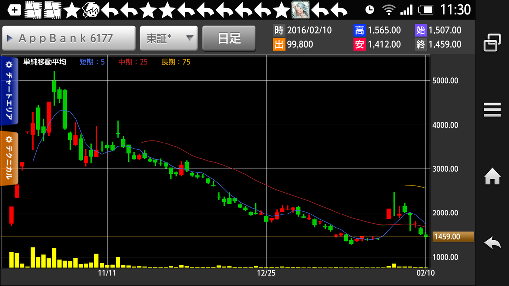 昨日見たときは1700円台とか言ってたけどまーだ落下中みたいですね