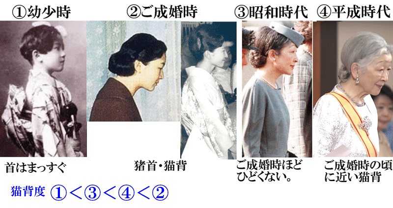 首の前傾を注視注意ているときは、顔は無視ねw子供時代のは、誰も本人かどうかはわからないの。前傾の病気は幼少時に発病するらしい。この写真以後に発病した可能性もあるから保留です。二枚目のは、下を向いているから、背筋をピンと伸ばしたその右側とは単純に比較できない。右端のは、高齢になって前傾が酷くなった。もうね、皇族影武者検証のスレ作ってそっちでやれば?次は今上、なる、雅子、あーや、紀子さまへと波及していくだろうから、ネタ枯れなし。