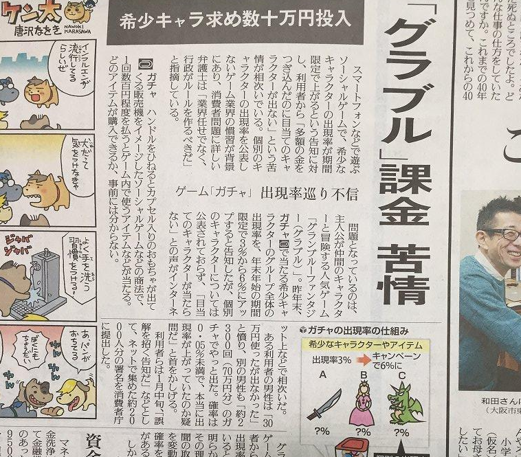 ガチャでは、目当てのキャラクターがいつ出るか分からない。ある利用者の男性は「30万円使ったが出なかった」と憤り、別の男性も「約2300回(70万円分)のガチャでやっと出た。確率は0・05%未満で、本当に出現率が上がっていたのか疑問」と話す。利用者らは1月中旬、「誤解を招く告知だ」などとして、ネットで集めた約2000人分の署名を消費者庁に提出した。