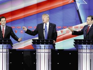 【ワシントン=今井隆、ロサンゼルス=田原徳容】テキサス州で25日開かれた米大統領選の共和党指名候補争いを巡る第10回テレビ討論会では、首位の不動産王ドナルド・トランプ氏(69)がライバルから集中砲火を浴びた。