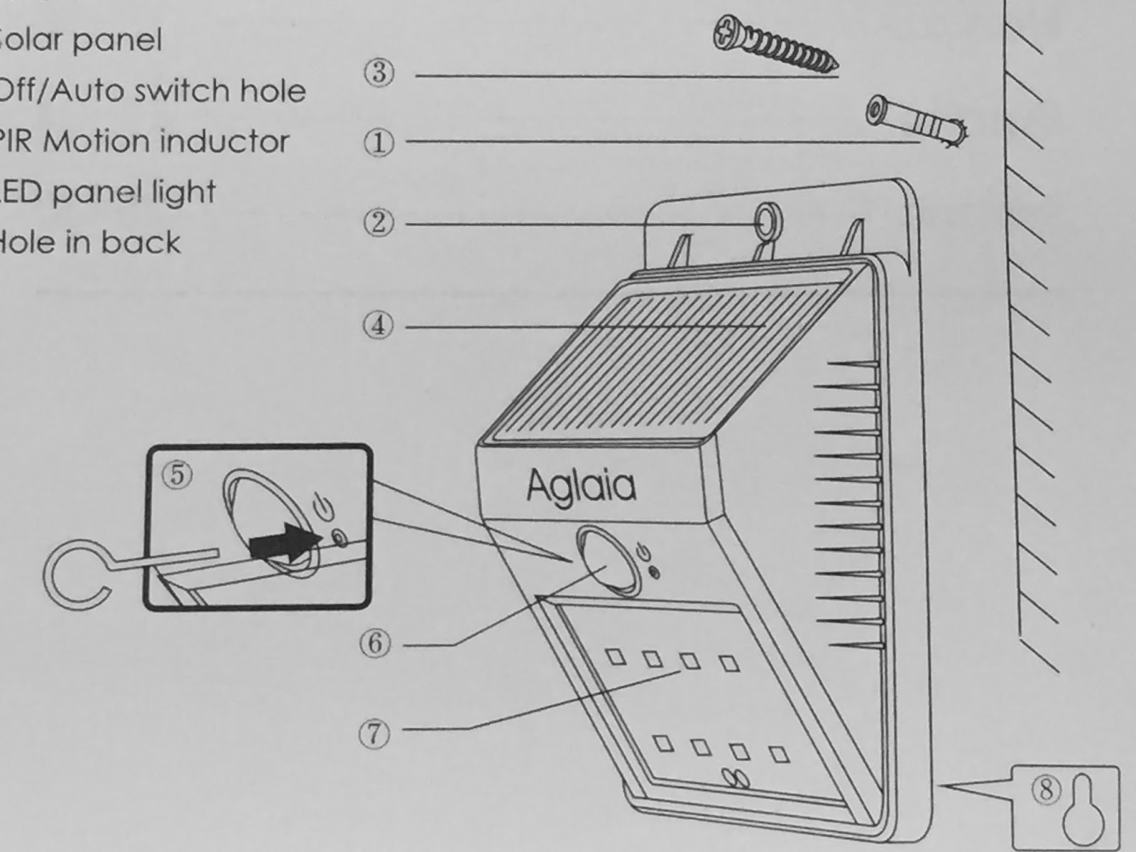 Aglaia 8LED ソーラーライト 人感センサー 屋外照明/軒先/壁掛け/庭先/玄関周りなどのライト 夜間自動点灯 LT-O1 (ブラック)