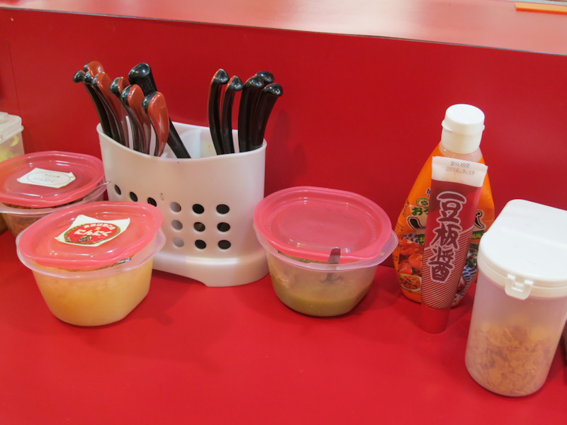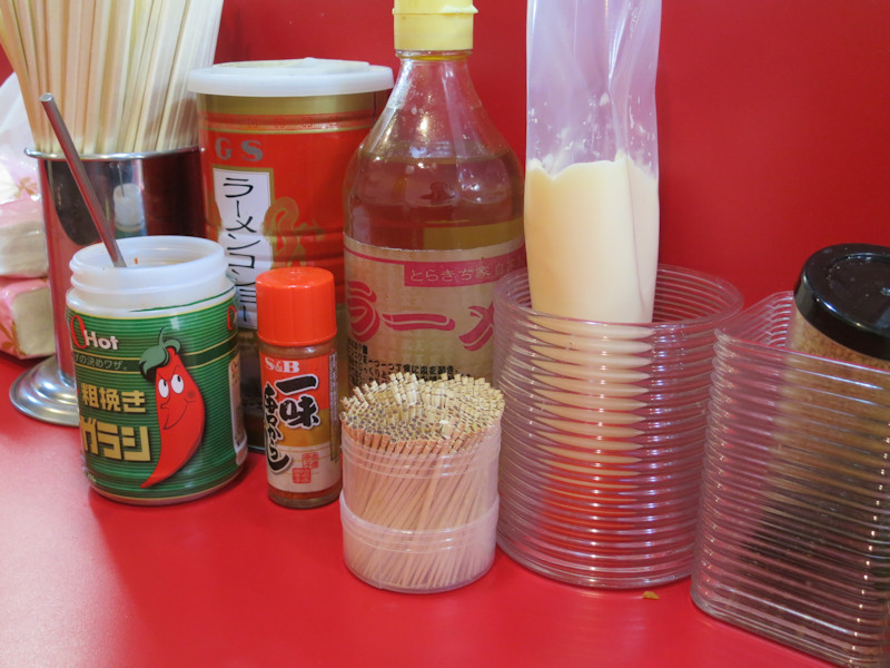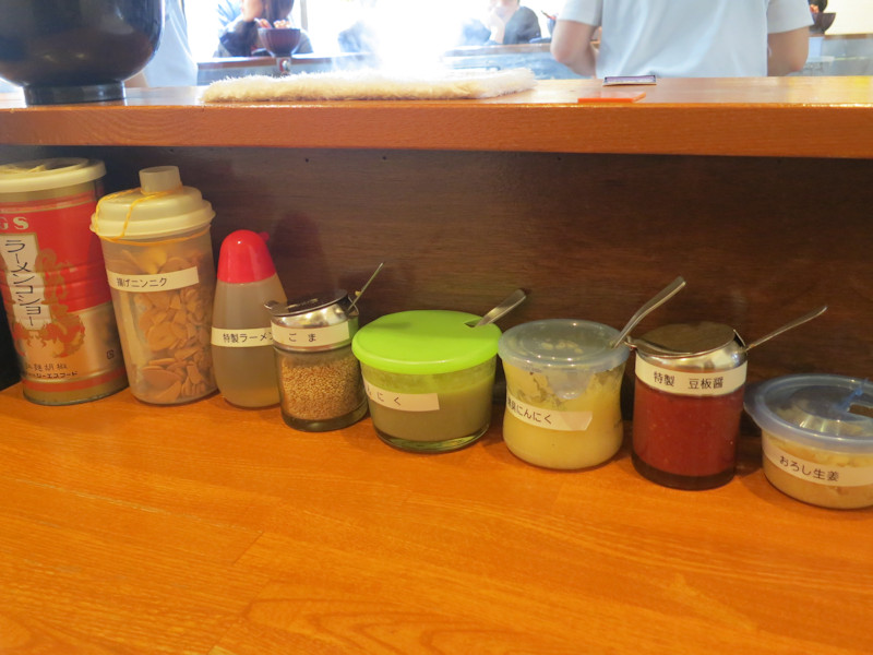 卓上にはおろし生姜、豆板醤、無臭にんにく、にんにく、ごま、特製ラーメン酢、揚げニンニク、ラーメンコショー、うーん、ちょっと足りないような気がします。