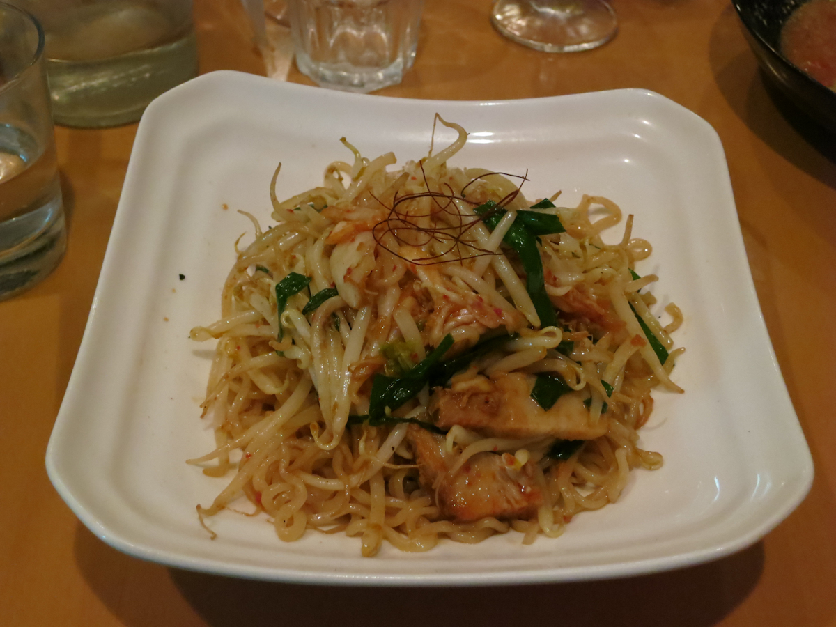 茹で上げた麺をモヤシ、ニラ、キムチ、豚バラ肉と共に炒め上げてあり、ピリ辛でとても美味しい。