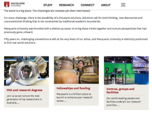 Mq.edu.au:このページでは先述の3番目のアプローチが用いられている。各トピックの詳細を示すために同じリンクを繰り返すということはせず、代わりに見出しをリンクにしている。