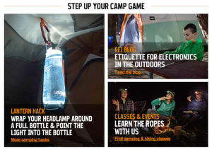 Rei.com email:ユーザーは下線のあるオレンジのリンクを流し読みすれば、大きな白い見出しを読まなくても、そのリンクから期待できることがわかる。「さらに詳しく」の代わりに、REIでは、「More camping hacks(:その他のキャンプの工夫)」や「Read the blog(:ブログを読む)」、「Find camping & hiking classes(:キャンプやハイキングのクラスを探す)」といった気を引く説明的なラベルを使っている。