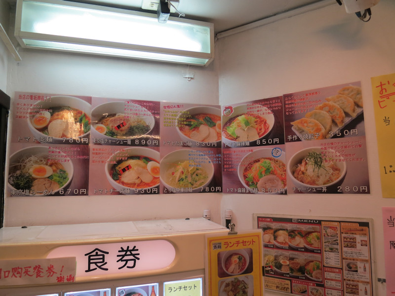 メニューはトマトラーメンのトッピングバラエティーかと思いきや、トマトラーメンは温麺、たまご麺、麻辣麺、麻辣まぜ麺のみで、後はトマトの入っていない醤油ラーメン、塩ラーメン。
