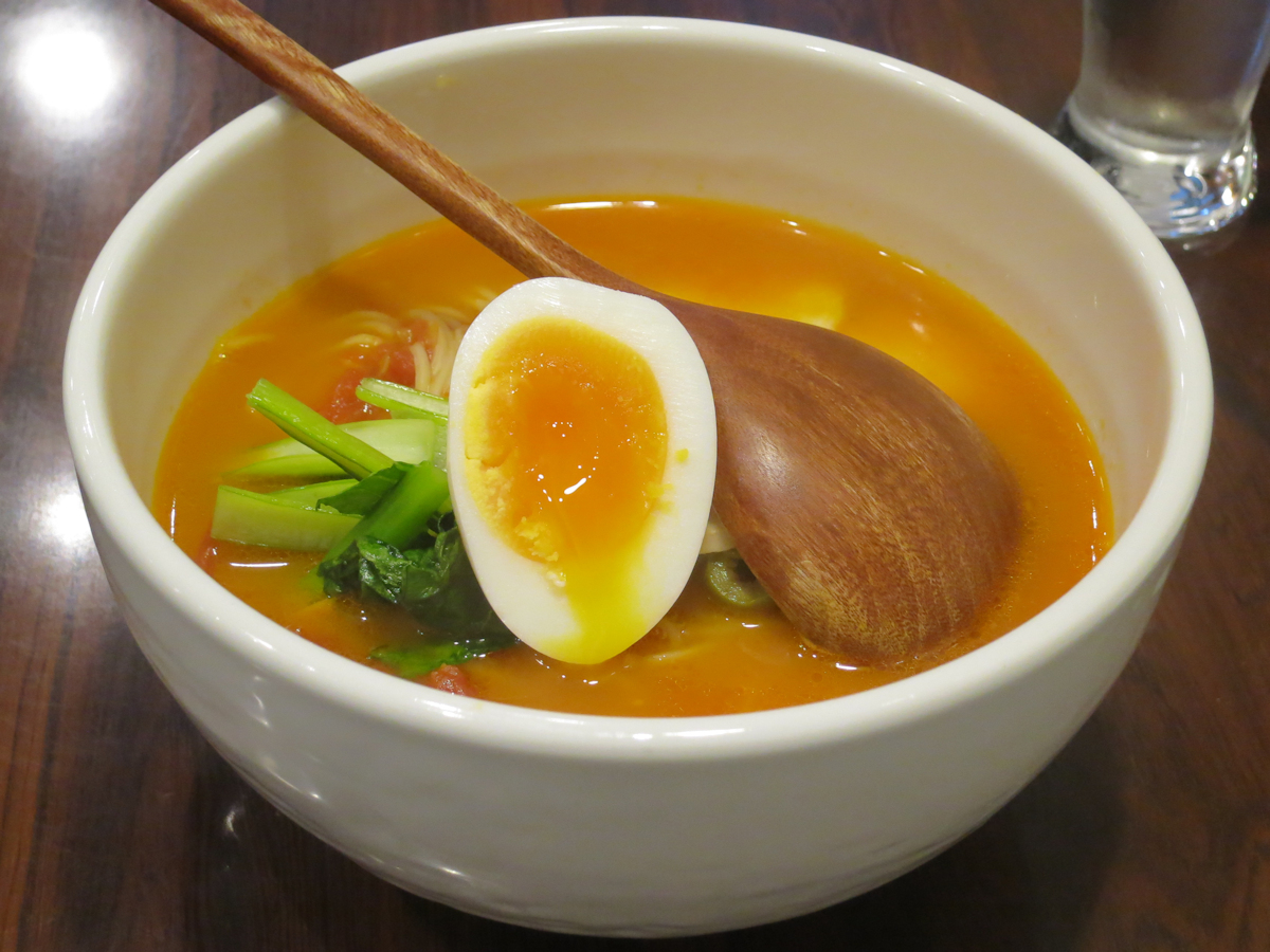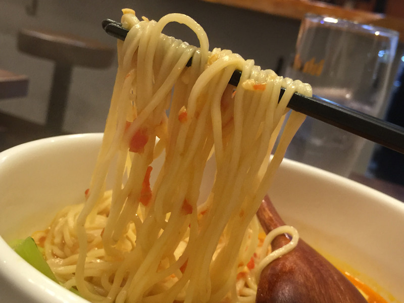 スープは赤いことは赤いけど濃いめの橙色で、鶏白湯(丸鷄のようでしたが)の旨味が支配的でトマトは色付け程度、ホールトマトは二つほどトマトスープと呼べるほどトマトは入っていません。