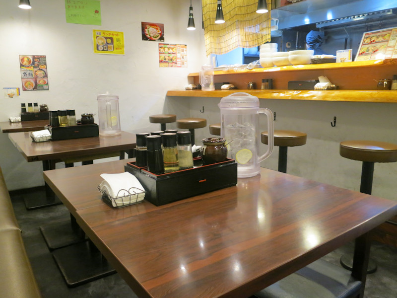 食券を買って店内へ、カウンター6席に2人掛けテーブルが6卓、卓上には醤油、酢、自家製辣油、白胡椒。