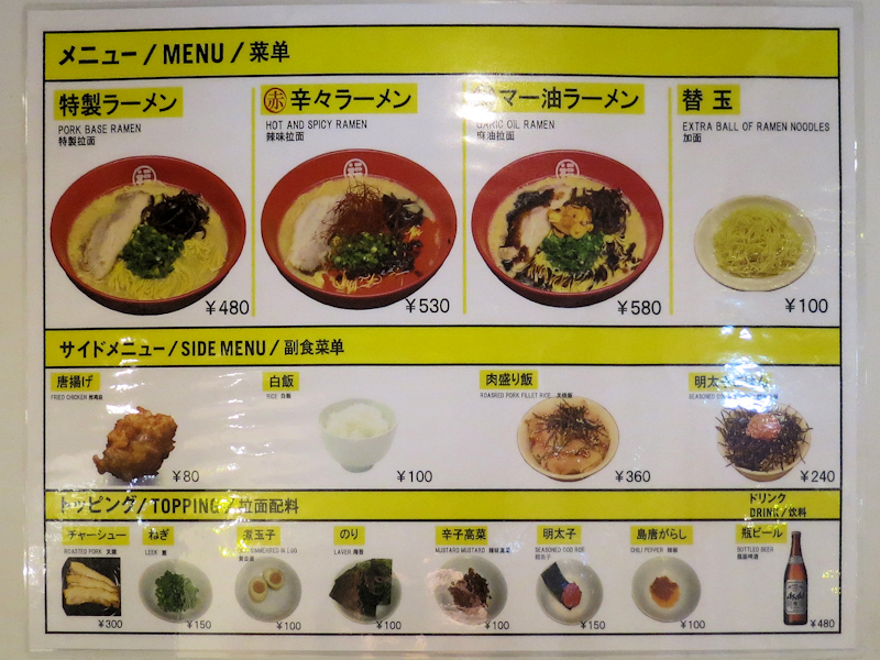 辛々530円、マー油580円とラーメンは三種類、替え玉は100円ですから、質を無視すれば、替え玉した時点で博多風龍に負ける(笑)
