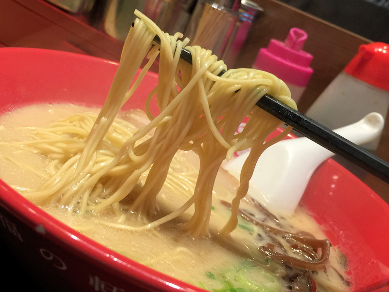 店内で時間を掛けて炊き出した豚骨スープ、骨感はほとんど感じられないものの、くどいほどの豚骨味なのに喉越しがサラリとしていて、とても美味しい。