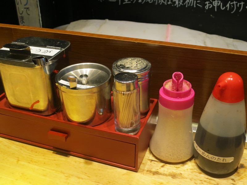 卓上には紅生姜、おろしニンニク、白胡椒、カレー粉、ラーメンのタレ。