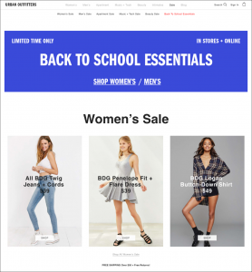 ミレニアル世代のあるユーザーはUrban OutfittersのWebサイトでセールのセクションを探していたが、「SHOP WOMEN’S(:婦人服)」というテキストを目にすると、その上にある鮮やかな色の背景に太字で大きく書かれた「BACK TO SCHOOL ESSENTIALS(:新学期の必需品)」という見出しを読まずに、いきなりそれ(:SHOP WOMEN’S)をクリックした。結果として、セールのセクション内にあるこの特設コーナーで買い物をすることになってしまったのだが、彼女は自分がセールのすべての内容を見ているわけではないことにまったく気づいていなかった。このセクションに彼女が望んでいたほどの種類のフィルターがないとわかると、彼女はがっかりして、このWebサイトのデザイナーたちを批判した。(本物のセールセクションには彼女が探していたフィルターがしっかりとあった)。