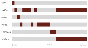 この図が示しているのは、ミレニアル世代のコンピュータの使用状況を自動記録するフィールド調査で見られた、ある参加者のマルチタスクの内容である。画面を記録したセッションから抜粋したこの10分間の中で、ユーザーは最初の5分で、お互い無関係の複数の作業を交互にてきぱきとおこなっている(ニュースのチェック、自分に来たEメールのチェック、Netflixの閲覧、Vimeoで動画を視聴、Facebookのチェック)。そして、その後、彼女は大学のクラスの論文に取り組みはじめている。…が、それはNetflixで「Sons of Anarchy」を見ながらだった。
