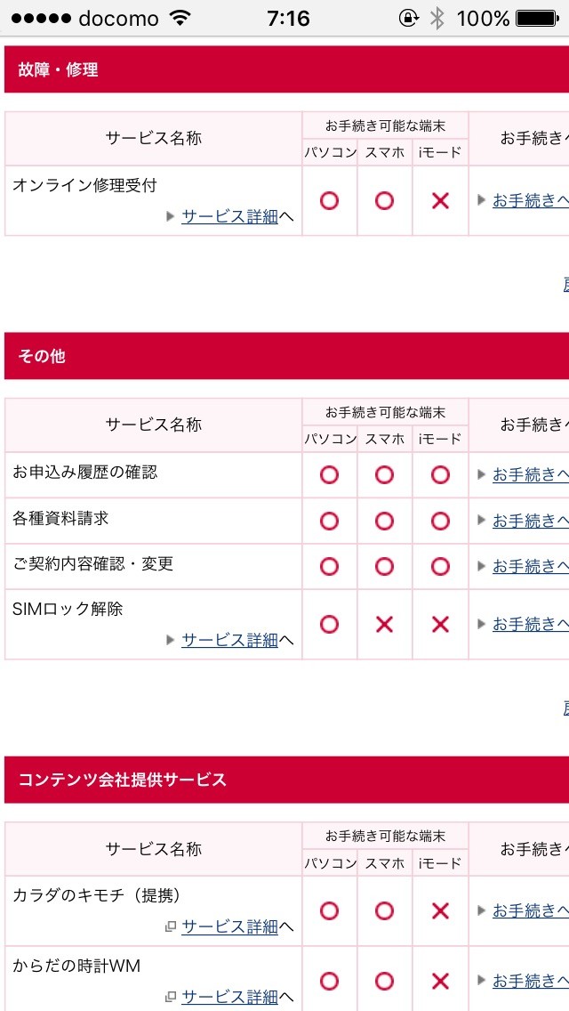 | Webサポートサービス | My docomo (パソコン版のみ) | auお客さまサポート | My SoftBank |
