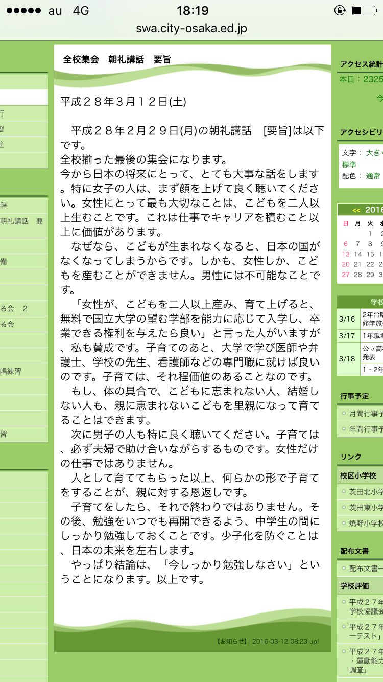 大阪市鶴見区の市立茨田北中学校の校長が全校集会で「女性にとって最も大切なことは、子どもを2人以上産むこと。仕事でキャリアを積むこと以上に価値がある」などと発言