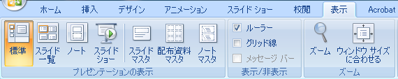 「表示」メニューの「プレゼンテーションの表示」グループの「スライドマスタ」。