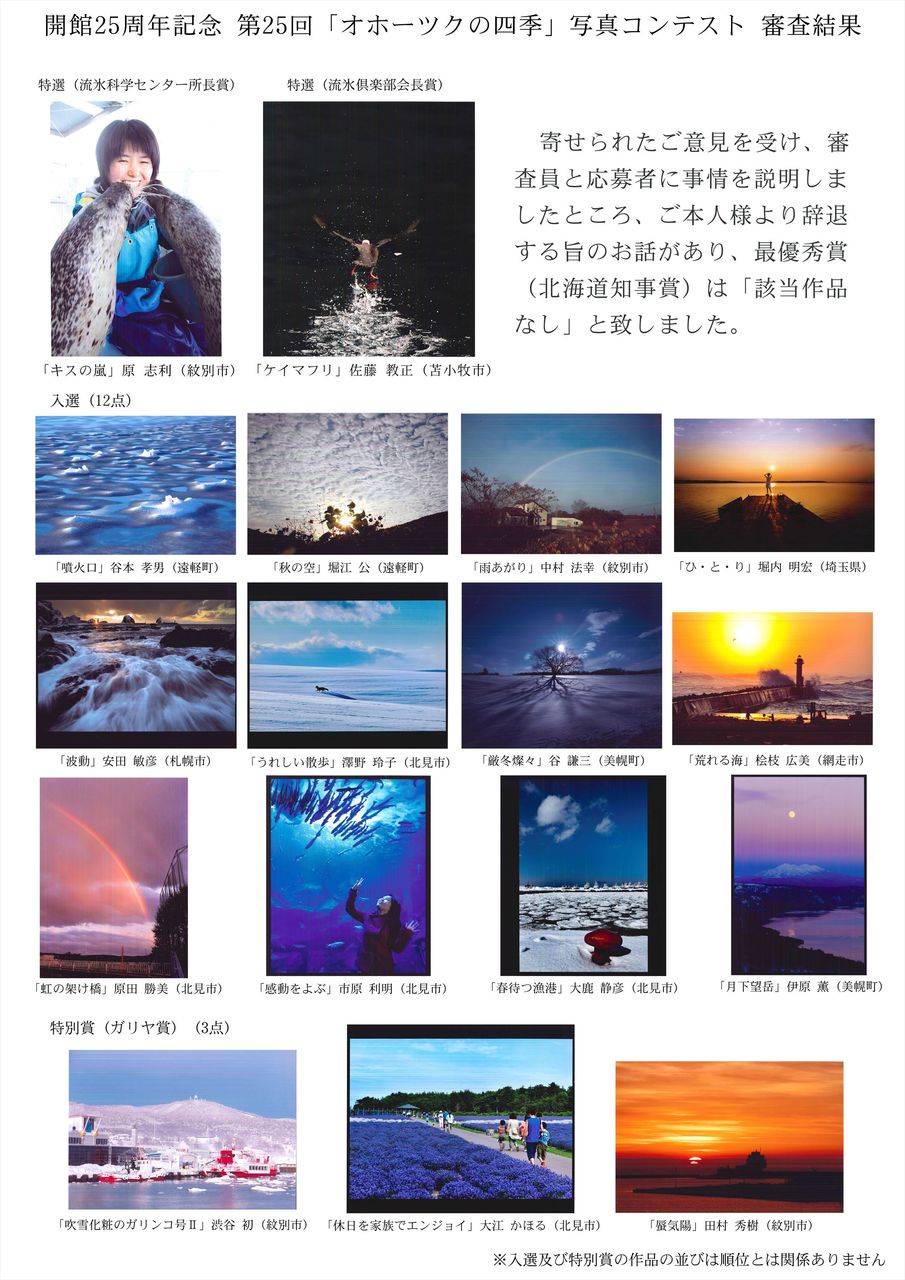 北海道立オホーツク流氷科学センター(紋別市)が実施した第25回「オホーツクの四季」写真コンテストで、海岸に打ち上げられて死んでいるとみられるクジラの上で男性がガッツポーズする作品が最優秀賞(道知事賞)に選ばれた。これに批判が殺到し、同センターは16日までに、最優秀作は「該当作品なし」として賞の取り下げを決めた。