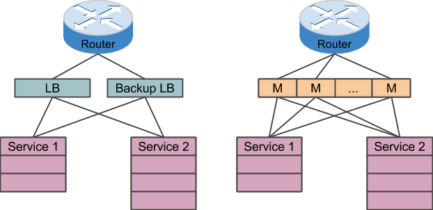 configuration to provide failover, wasting at least half of the load balancing capacity. Maglev load balancers don't run in active-passive configuration. Instead, they use Equal-Cost Multi-Path routing (ECMP) to spread incoming packets across all Maglevs, which then use consistent hashing techniques to forward packets to the correct service backend servers, no matter which Maglev receives a particular packet. All Maglevs in a cluster are active, performing useful work. Should one Maglev become unavailable, the other Maglevs can carry the extra traffic. This N+1 redundancy is more cost effective than the active-passive configuration of traditional hardware load balancers, because fewer resources are intentionally sitting idle at all times.