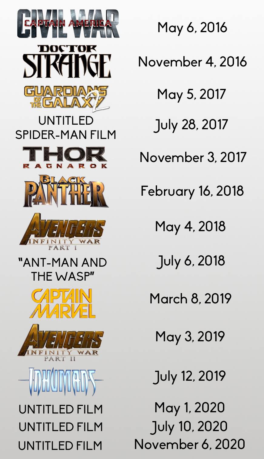 最後にこれから先公開されるマーベルシネマティックユニバースの映画一覧をどうぞ
