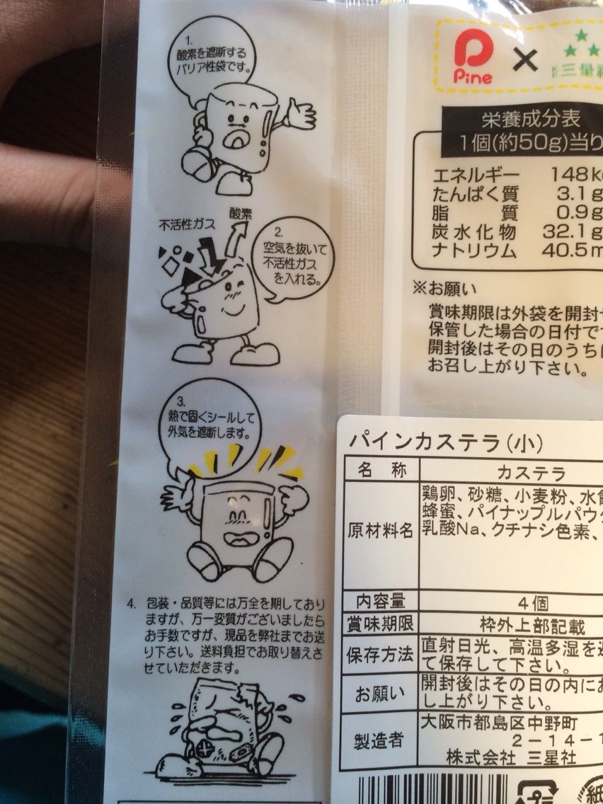「パインカステラ」も当然、パインアメのパッケージを継承してるわけです。見た瞬間の「何だコレは!!!!」感がここ数年で1番高かったように思えます。ということで、見た瞬間に発狂、即購入を決めました。