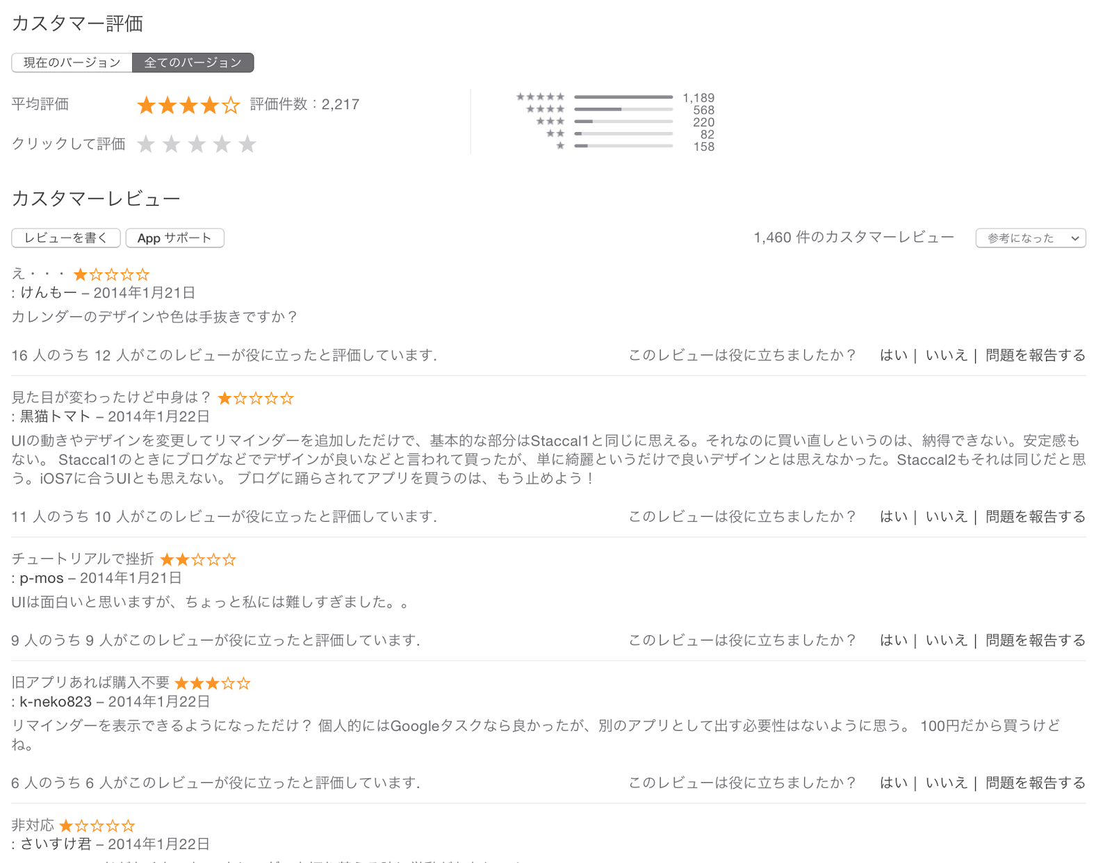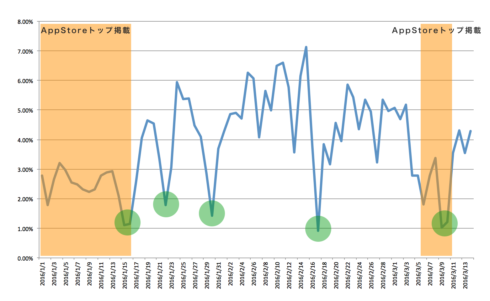 Staccalに限った事かもしれませんが、アップデート(グラフの緑丸の部分)をすると毎回CVRが低下します。グラフに表わしていませんが、ダウンロード数も底を打ちます。これはアプリのレーティングがアップデートのタイミングでチャラになり、最新バージョンのレーティングが反映されるまで1日程度かかる為と思われます。全てのバージョンのレーティングも4.1程度とそれほど悪くは無いのですが、過去にいただいた★1のレビューで役に立ったと票を集めたものがレビューの先頭を占めている状況な為、あまり心証が良くないのではないかと思います。こればかりは回避しようが無いようです。。