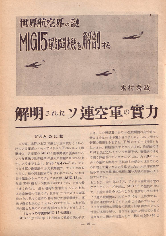 いかなる経緯からか米国の航空雑誌「エアロダイジェスト」1951年7月号にミグ設計局の片翼、ミハイール・グレーヴィチの手記が掲載された、という事実だ。