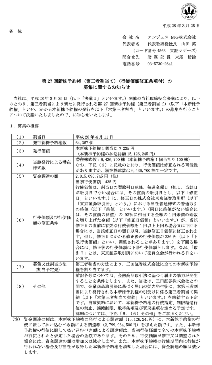 第27回新株予約権(第三者割当て)(行使価額修正条項付)の募集に関するお知らせ