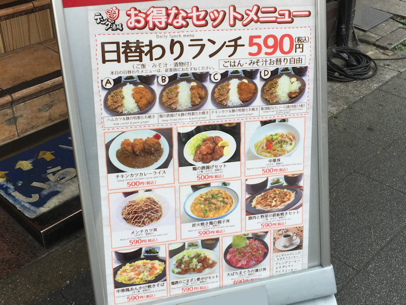 ランチは500円から690円、日替わりランチ590円は、ハムカツ&豚の特製たれ焼き、鶏の唐揚げ&豚の特製たれ焼き、チキンカツ&豚の特製たれ焼き、鶏の唐揚げおろしソース&豚の特製たれ焼き、の四種類。