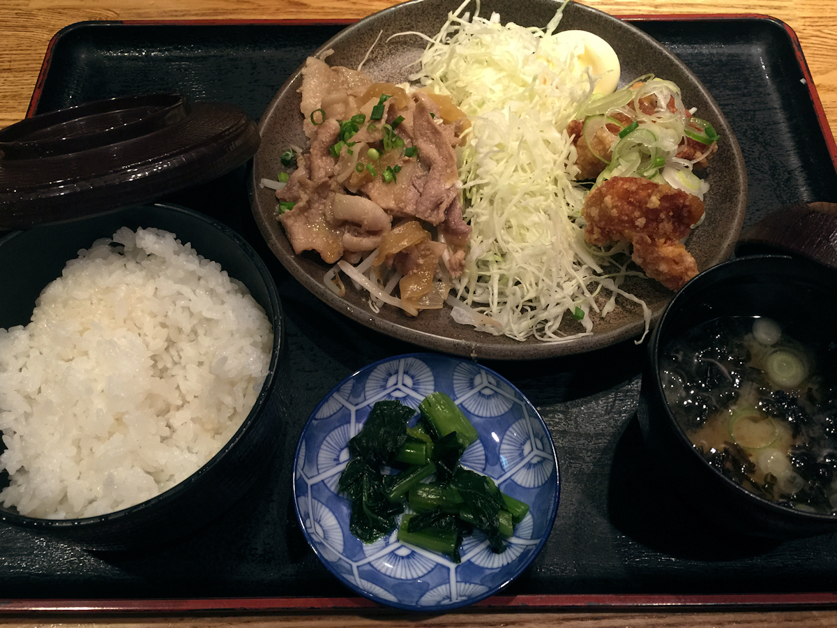 日替わりなのでどれになるかは店員さんに聞かないと分からない仕組み、今日は鶏の唐揚げおろしソース&豚の特製たれ焼き。