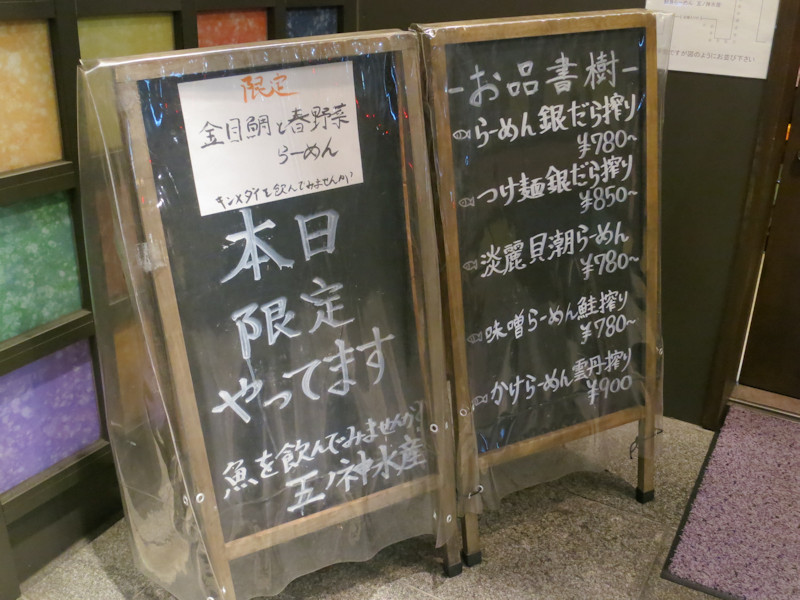 仕事が遅くなりそうなので、現場に向かう途中下車してらーめん五ノ神水産@淡路町(千代田区神田多町)へ。