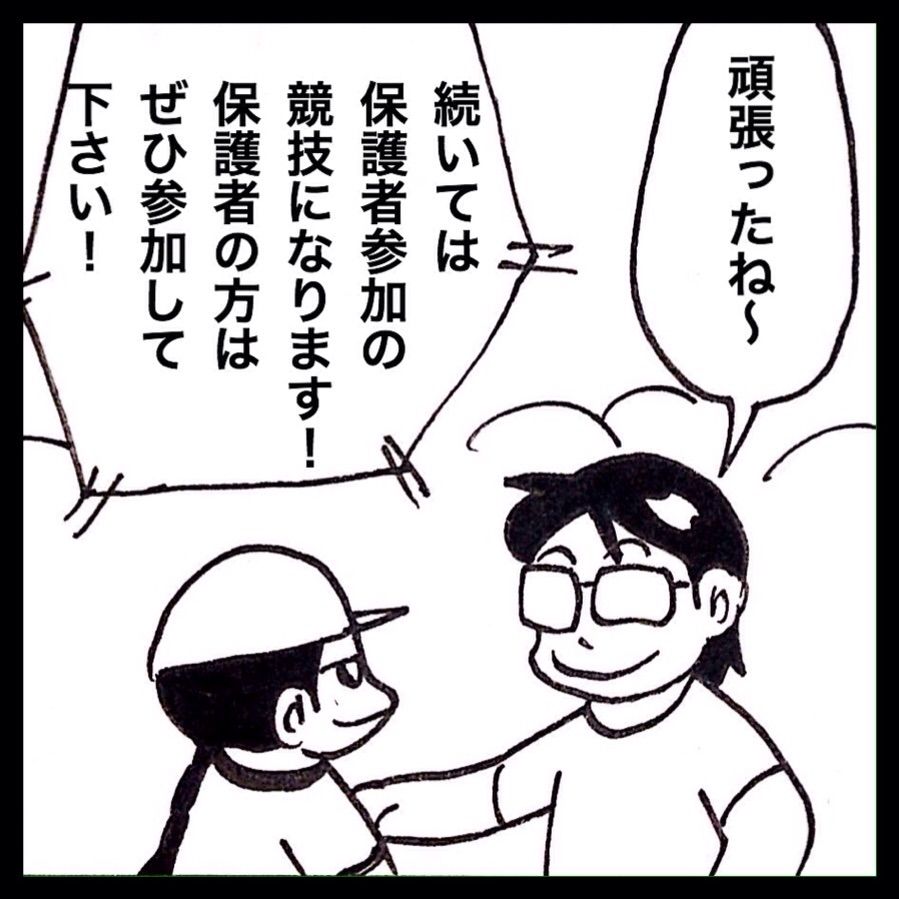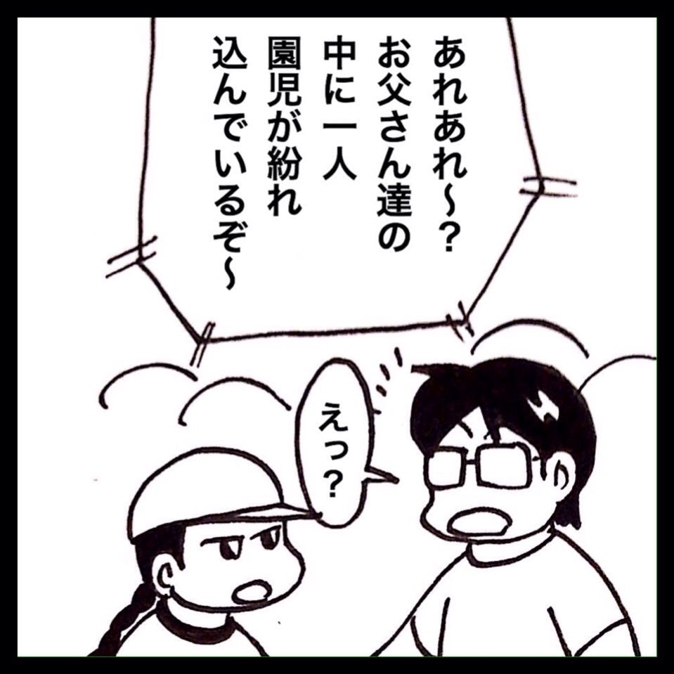「あれあれ〜お父さん達の中に園児が1人紛れ込んでいるぞ〜」