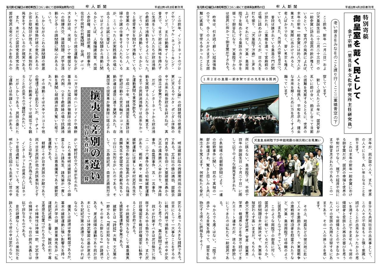 その後、平成22年に牢人新聞社を創設し、機関紙を発行して定例演説をする啓蒙活動を行ってきました。