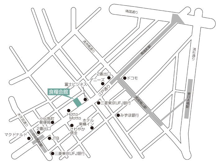 ・ 東京駅−(JR総武線快速4分)→馬喰町駅−(徒歩5分)→現地
